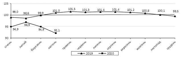 За даними Держстату, у січні–квітні 2020 року порівняно із січнем–квітнем 2019, індекс промислової продукції становив 92,1 %, у тому числі: