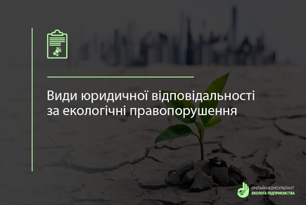 Відповідно до статті 68 Закону України «Про охорону навколишнього природного середовища» (далі — ЗУ № 1264-XII), за екологічні правопорушення передбачено чотири основні види юридичної відповідальності: