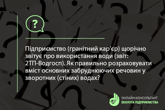 Підприємство (гранітний кар’єр) щорічно звітує про використання води (звіт: 2ТП-Водгосп). Як правильно розраховувати вміст основних забруднюючих речовин у зворотних (стіних) водах?