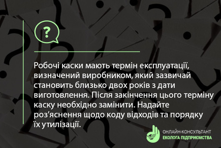 Робочі каски мають термін експлуатації, визначений виробником, який зазвичай становить близько двох років з дати виготовлення. Після закінчення цього терміну або у разі наявності пошкоджень (тріщин, деформацій тощо) каску необхідно замінити, а використаний виріб утилізувати. Надайте роз’яснення щодо коду відходів та порядку їх утилізації.