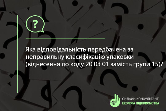 Підприємство займається виготовленням кондитерської продукції. Упаковку від харчових продуктів і напівфабрикатів викидають у контейнер для твердих побутових відходів (код 20 03 01) та передають як відходи за кодом 20 03 01 «Змішані побутові відходи». Водночас такі відходи необхідно відносити до відходів групи 15. Яка відповідальність передбачена для підприємства згідно із законодавством?