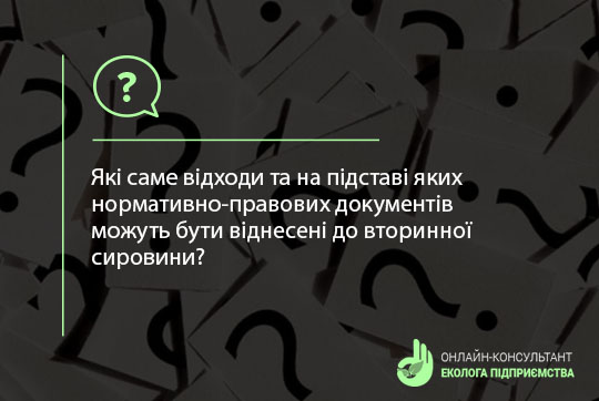 На жаль, ані в Законі України «Про управління відходами», ані в Податковому кодексі України наразі відсутнє визначення терміна «вторинна сировина». Відповідно, відсутній і законодавчий акт, на підставі якого окремі матеріали чи відходи можна однозначно віднести до вторинної сировини.