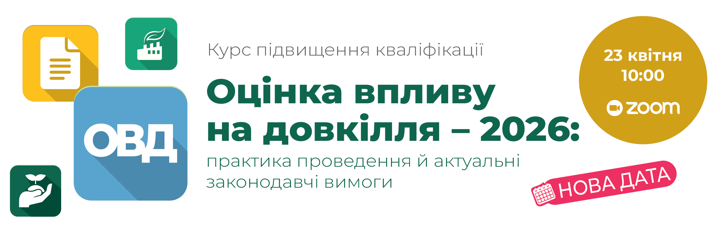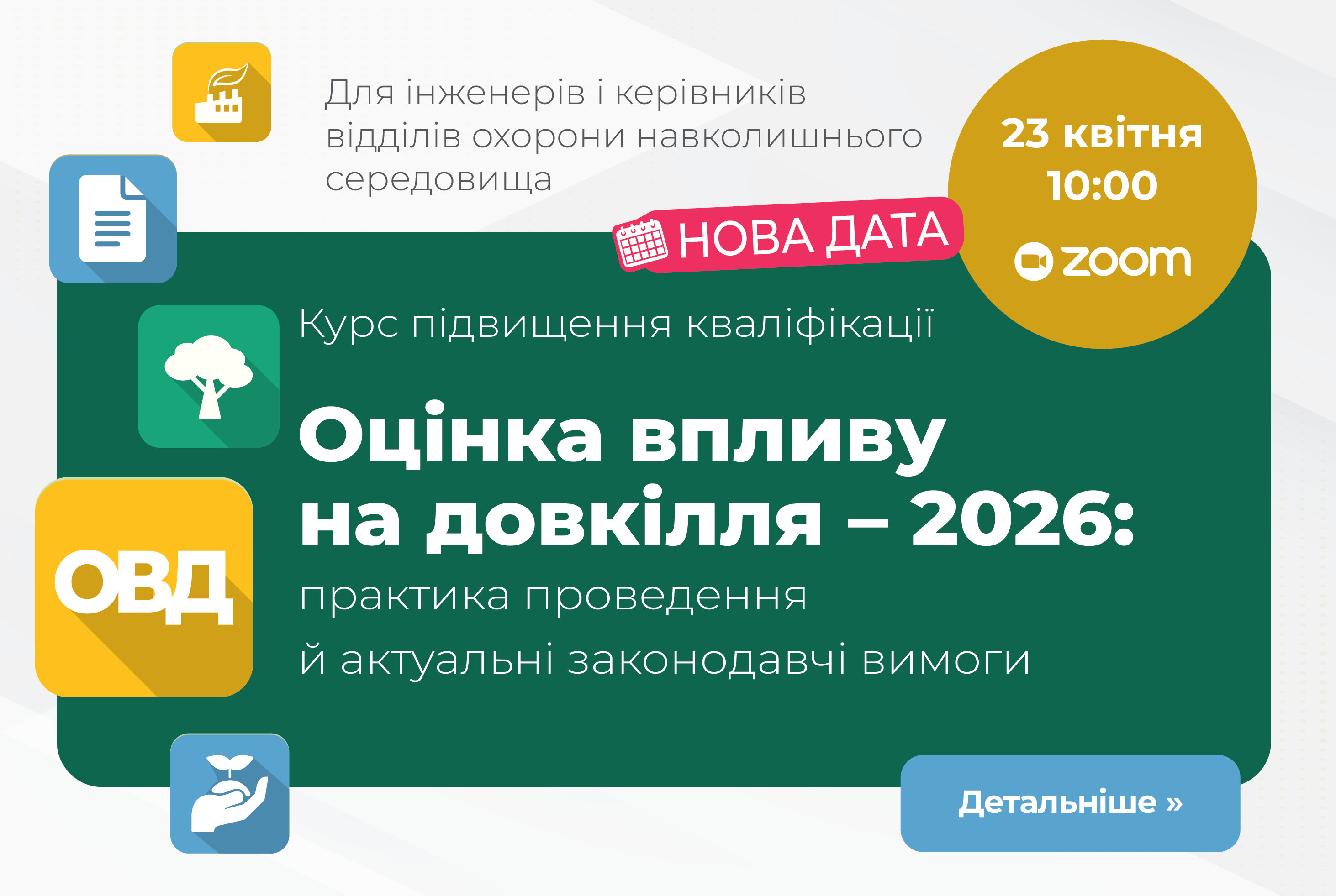 Запрошуємо вас 26 лютого 2026 року узяти участь в інтенсив-курсі підвищення кваліфікації «Оцінка впливу на довкілля – 2026: практика проведення й актуальні законодавчі вимоги», де обговоримо основні аспекти проведення процедури ОВД у 2026 році: