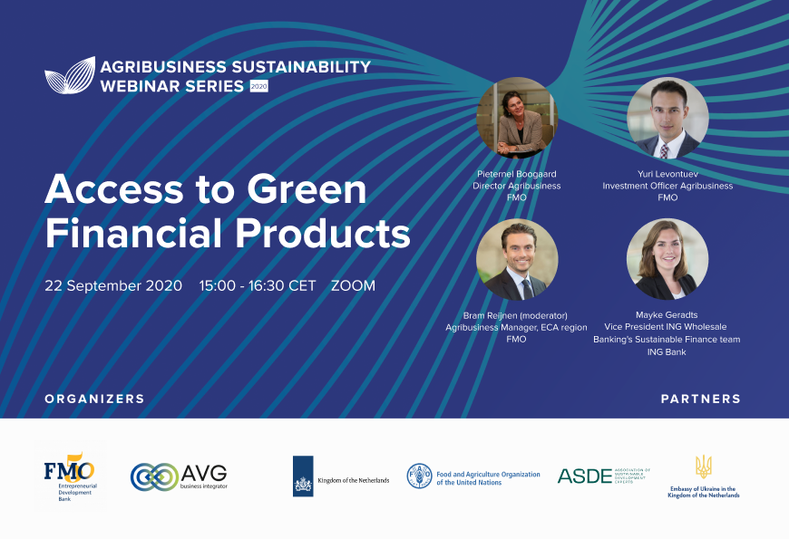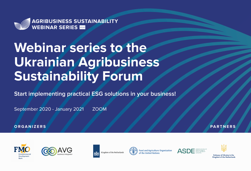 Нідерландський банк розвитку FMO спільно з українською консалтинговою компанією AVG проведуть серію вебінарів зі сталого розвитку агросектору Східної Європи та Середньої Азії. Ціль вебінарів – надати інформацію про «зелені» інвестиційні продукти FMO і міжнародних фінансових організацій, а також про екологічно-соціальні вимоги до їх отримання.