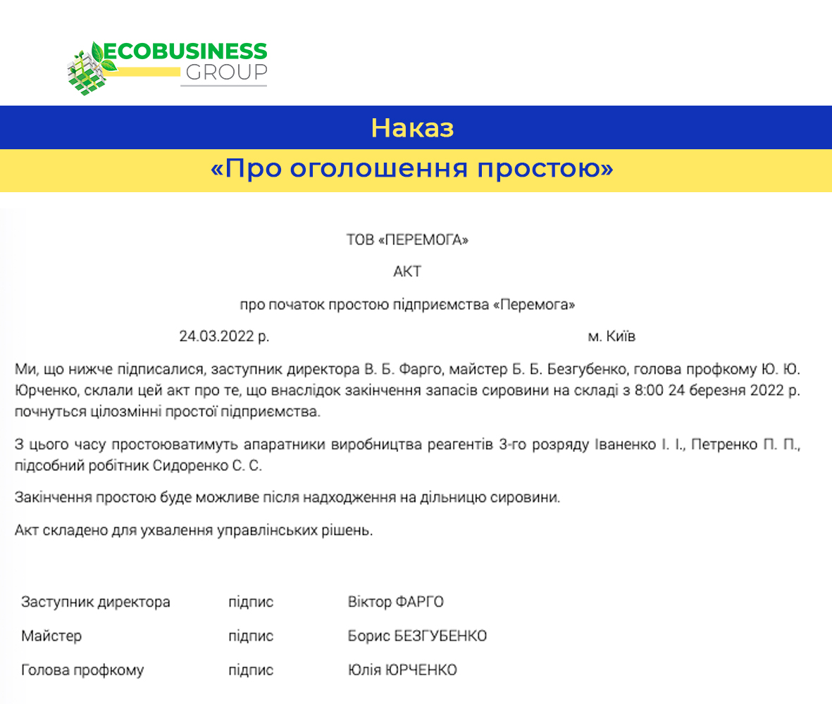 Попередньо ми розглянули зразок наказу «Про оголошення простою». Та навели єдиний алгоритм заповнення наказу, а саме: