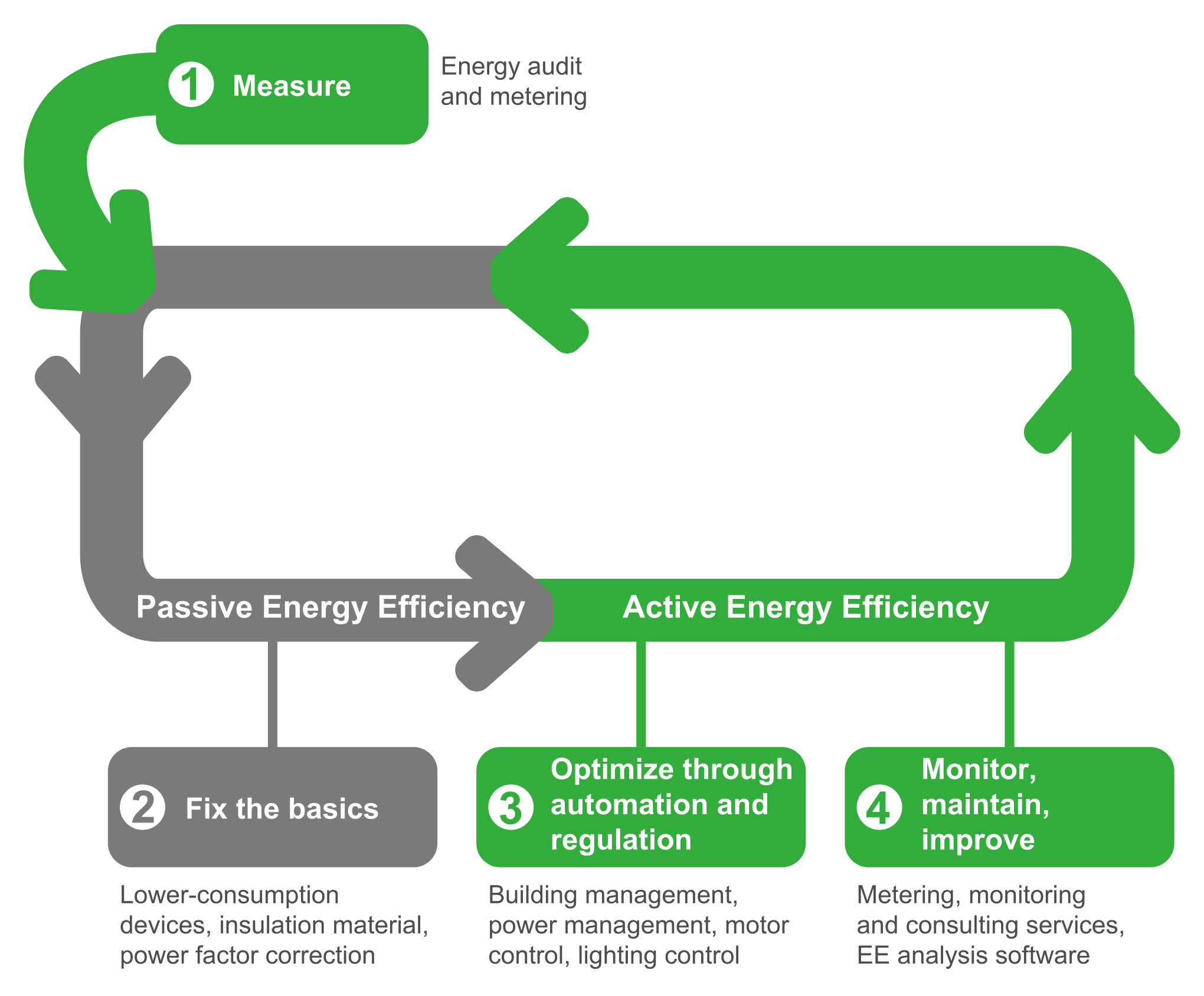 Активна енергоефективність досягається шляхом створення інфраструктури для вимірювання, моніторингу та контролю використання енергії з метою внесення довготривалих змін. (див . рис Рішення з енергоефективності на основі життєвого циклу).