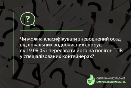 Наша компанія планує встановлення локальних водоочисних споруд. Кількість стоків (включно з дощовими) становить приблизно 3000 м³ на місяць. Технологія нашого виробництва не потребує використання води; на підприємстві утворюються лише господарсько-побутові стоки з високою концентрацією амонійного азоту (під час очистки він буде видалятися). На підприємстві працює 5000 осіб. Після очистки стічної води утворюється зневоднений осад (приблизно 100 кг/доба). Чи можна класифікувати його як 19 08 05 – шлами від оброблення міських стічних вод та передавати на полігон ТПВ (осад буде спресований у спеціалізованих контейнерах)?