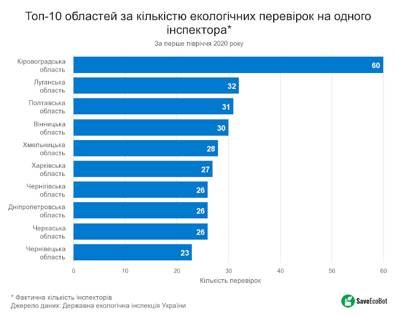 І в такому порівнянні лідерство отримує Кіровоградська область із показником – 60 перевірок на одного фактично працюючого інспектора. 32 перевірки за півріччя робив один інспектор в Луганській області, майже як і в Полтавській – 31 перевірка. Традиційно забруднена Дніпропетровська область не потрапила у п'ятірку лідерів, а Донецька – навіть у десятку.