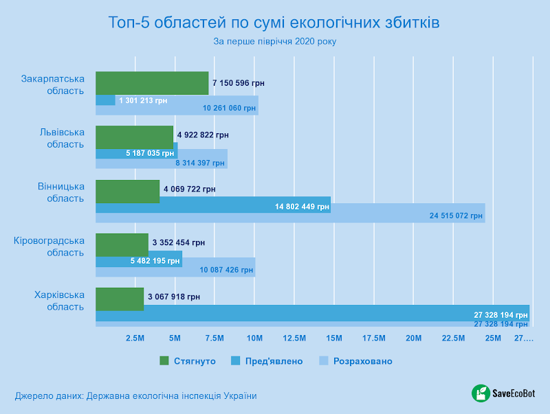 І тут дані про розраховані, пред’явлені та стягнуті суми збитків дуже сильно відрізнються, бо є суттєво вищими за суми штрафів. Наприклад, з переліку ТОП-5 областей у Харківській області сума розрахованих та пред’явлених збитків становить 27 328 194 грн, тоді як стягнуто було лише 3 067 918 грн, що становить трішки більше 11%.