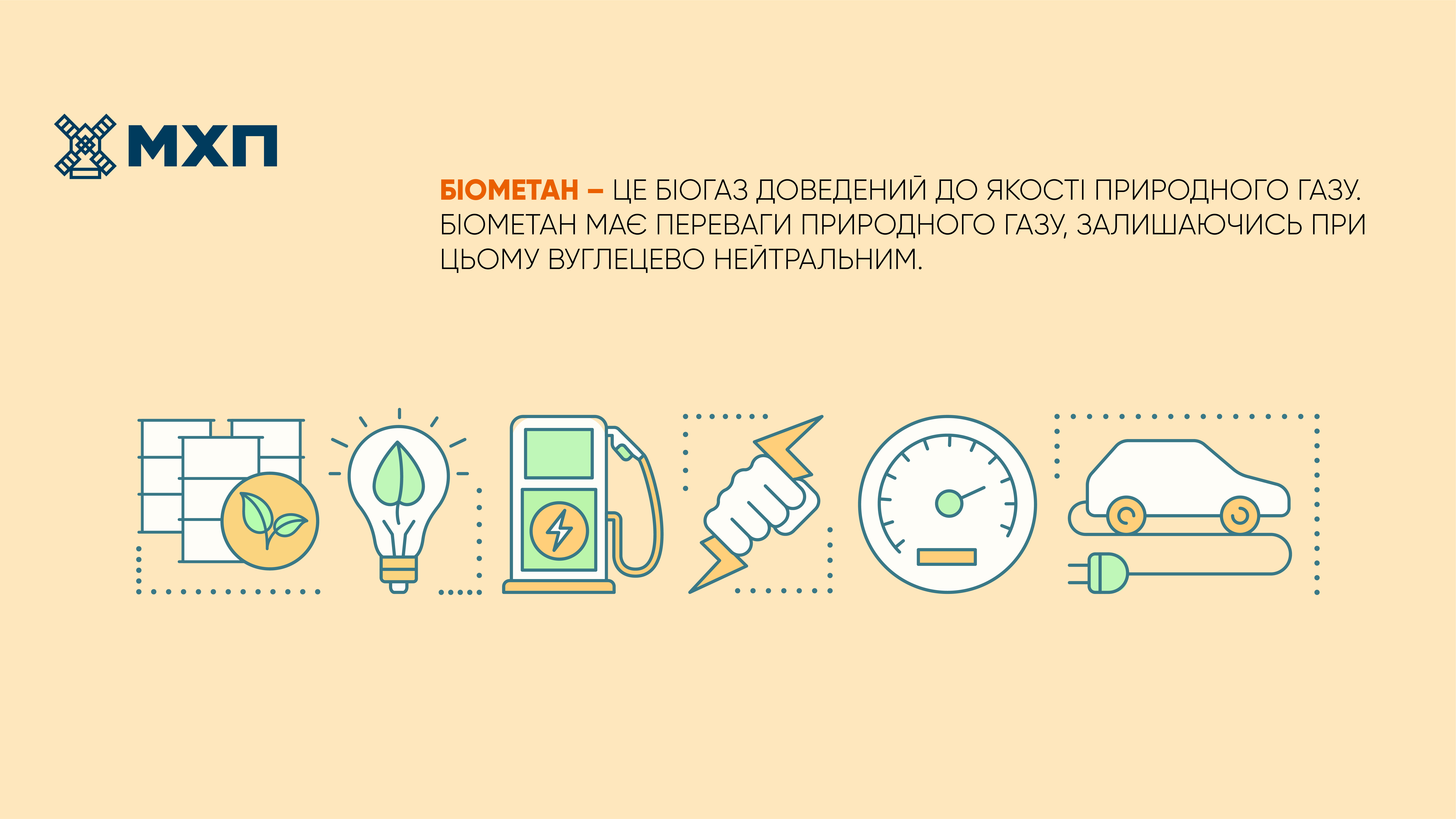 Компанія МХП має суттєвий потенціал виробництва біометану. На існуючих потужностях біогазових комплексів можливим є виробництво близько 40 млн метрів кубічних на рік біометану; на основі органічних відходів компанії обсяги можуть становити близько 100 млн метрів кубічних на рік; а на основі органічних відходах з інтеграцією «зеленого» водню — 150 млн метрів кубічних на рік.
