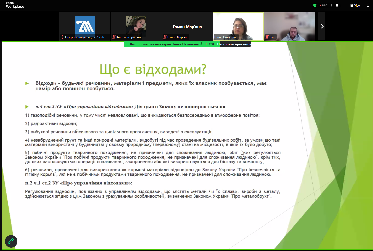 У межах курсу Ганна Натоптана, директорка проєктно-консалтингової компанії «ЕКОПРОФІТ», послідовно розкрила всі етапи роботи з відходами на підприємстві. Серед ключових тем: