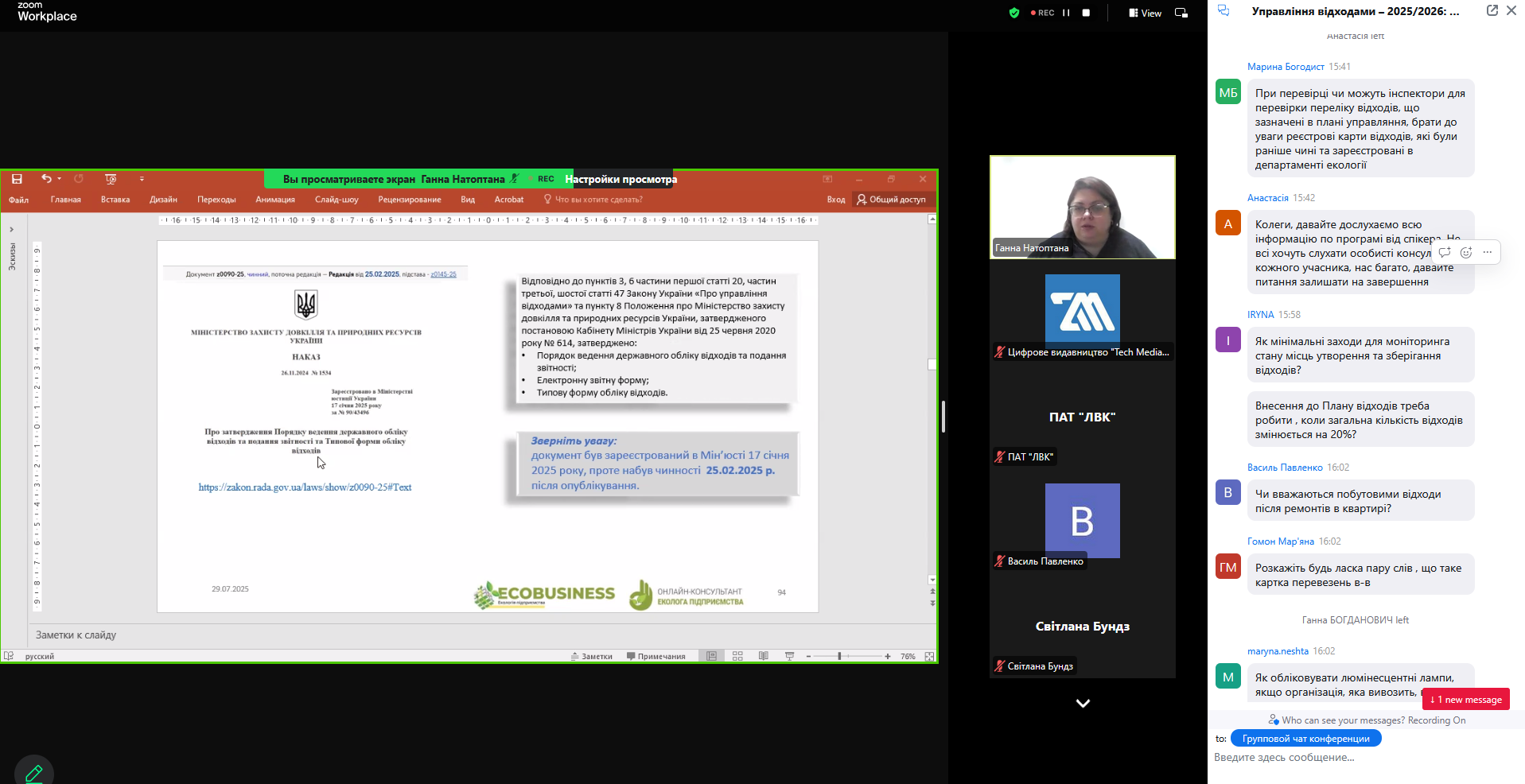 Саме тому 11 грудня на інтенсив-курсі підвищення кваліфікації «Управління відходами – 2025/2026: як упровадити нові вимоги без порушень законодавства», організованому е-журналом «ECOBUSINESS. Екологія підприємства» та системою «Онлайн-консультант еколога підприємства», пролунало понад 150 запитань від більш ніж 50 учасників.