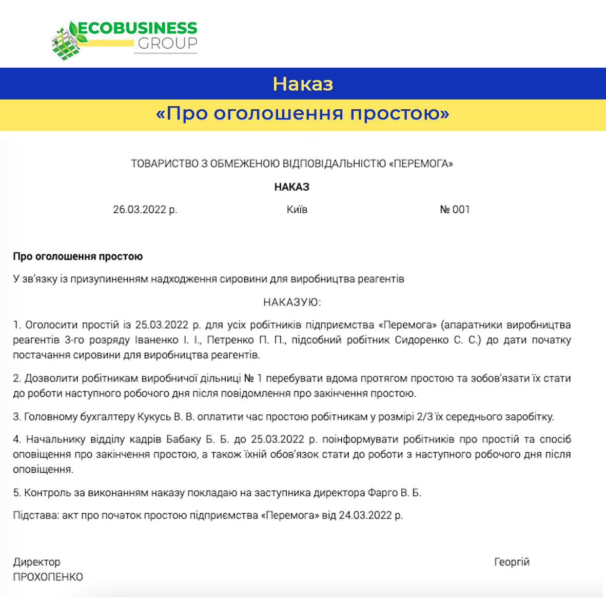 Сьогодні пропонуємо розглянути зразок наказу «Про оголошення простою».