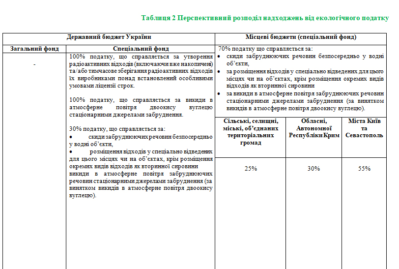 У зв’язку з зазначеним, пропонується запровадити розподіл надходжень від екологічного податку, викладений в таблиці 2