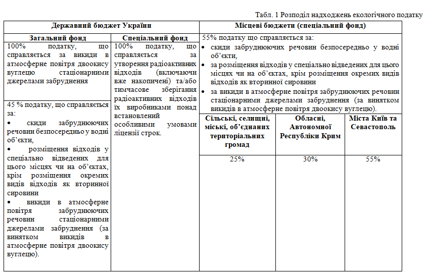 Розподіл надходжень екологічного податку зазначено в таблиці 1.