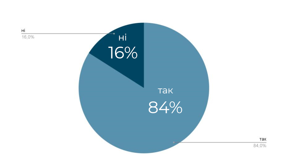2. Переважна більшість учасників (84 %) переконана, що сфера екологізації (система державної політики, підходи до держекоконтролю, відповідальність бізнесу та громад) потребує негайного реформування і лише 16 % вважають стан задовільним (111- Так, 21- Ні)