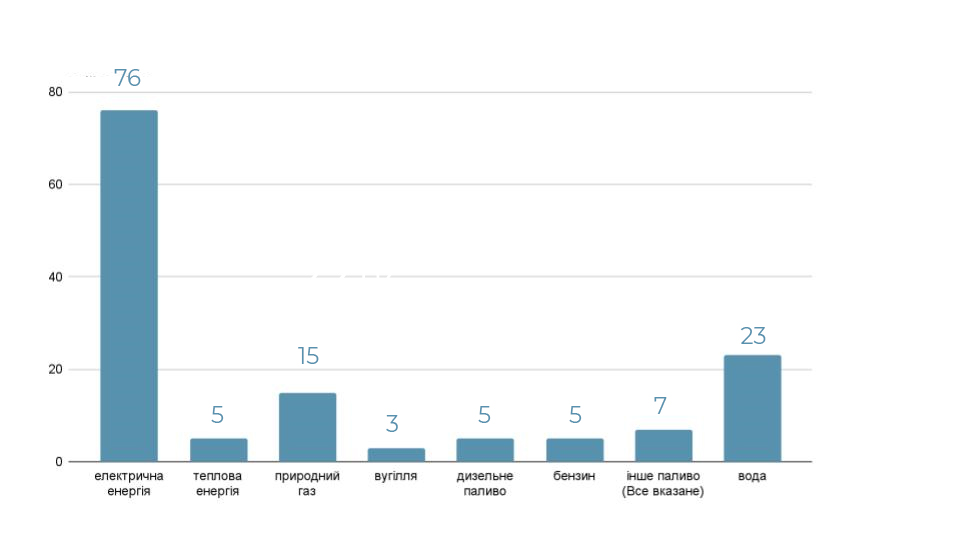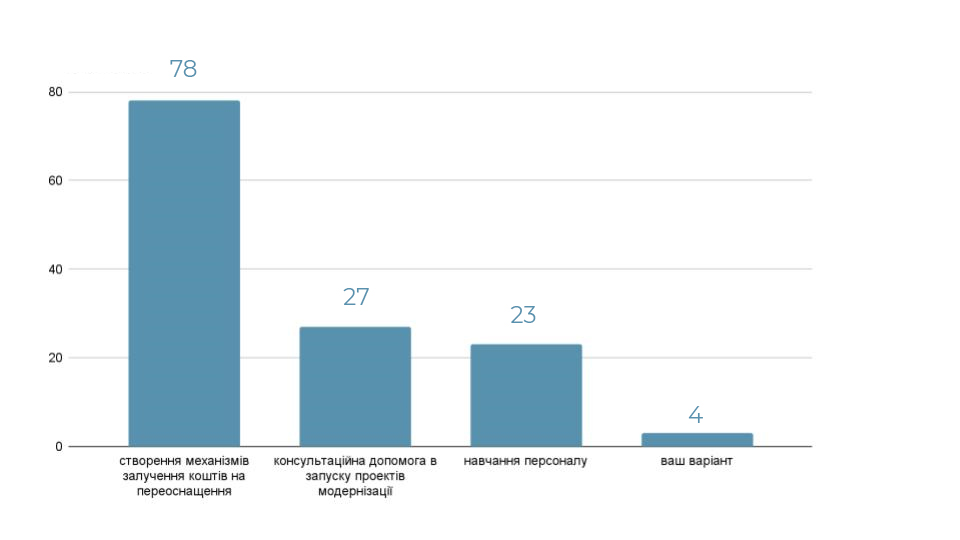6. 83 % всіх опитаних не відчувають браку спеціалістів в сфері енергозабезпечення та енергоефективності (110 із 132), однак 22 респонденти все ж вказали на низький рівень кваліфікації фахівців, а також відзначили проблемними будівництво власних виробництв з СЕС та біометану; комунальної сфери; лабораторних досліджень; Енергомоніторингу; В системі енергоефективності; в територіальних громадах; в нагрівальних агрегатах (печах), які працюють на природному газі.