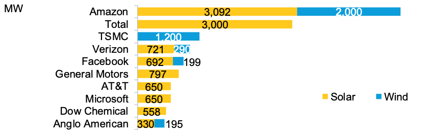 Amazon була провідним покупцем чистої енергії у 2020 році, оголосивши про 35 окремих PPA чистої енергії у 2020 році загальною потужністю 5,1 ГВт. Наразі компанія придбала понад 7,5 ГВт зелених потужностей, випередивши Google (6,6 ГВт) і Facebook (5,9 ГВт). Наступними найбільшими корпоративними покупцями чистої енергії у 2020 році стали французька нафтова компанія Total (3 ГВт), TSMC (1,2 ГВт) і американська телекомунікаційна компанія Verizon (1 ГВт).