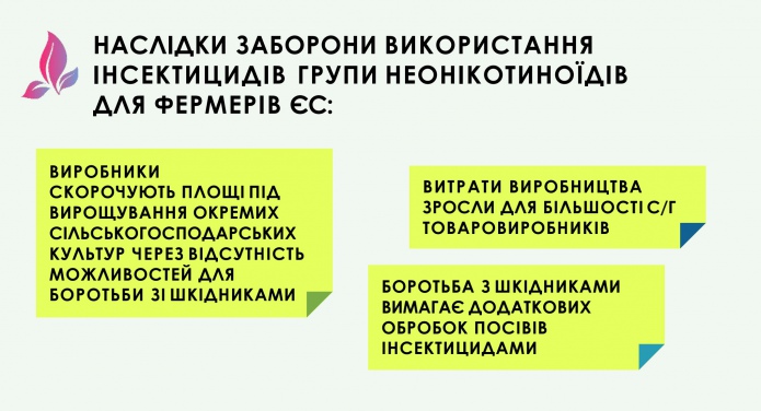 «Проблема в тому, що адекватної заміни неонікотиноїдам з точки зору ефективності контролю шкідників практично немає. При обмежених варіантах боротьби зі шкідниками очікуваним наслідком буде зменшення урожайності культур, а також здорожчання вартості обробки альтернативними засобами. При цьому далеко не факт, що препарати-замінники будуть більш екологічними, зокрема, з огляду на бар’єри щодо виходу новітніх ЗЗР на ринок України», — розповідає експерт.