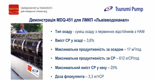Також під час вебінару учасники розглянули результати роботи дегідраторів на різних комунальних та промислових об’єктах та продуктивність демонстраційної моделі MDQ-450, яка протягом другого півріччя минулого року побувала на багатьох водоканалах України та Східної Європи. Дана конструкція підтвердила свою ефективність в очищенні стічних вод та допомагає знизити негативний вплив на довкілля.