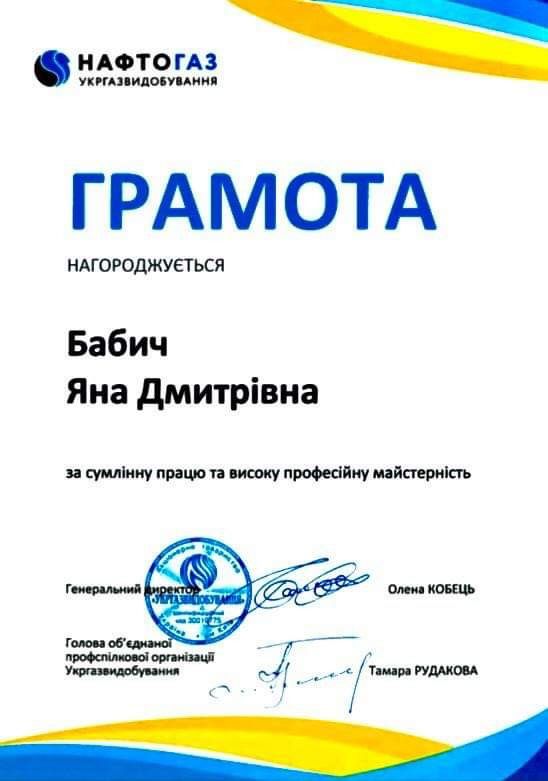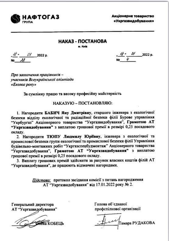 Так, фіналісти 2021 року Бабич Яна (Філія Бурове Управління «Укрбургаз» АТ «Укргазвидобування») та Тюпа Людмила (Управління будівельно-монтажних робіт «Укргазспецбудмонтаж» АТ «Укргазвидобування») були відзначені не лише організаторами конкурсу на підсумковому форумі «ЕКОтрансформація» та всією експертною спільнотою, а й отримали почесну відзнаку від Генерального директора та Голови об’єднаної профспілкової організації «Укргазвидобування».
