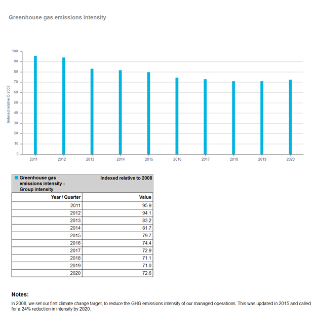 • У 2020 році компанія також сформулювала більш чіткий зв'язок між винагородою керівника та цілями щодо зміни клімату: зменшити абсолютні викиди на 15% до 2030 р. та інтенсивність викидів на 30% (відносно базового рівня власного капіталу 2018 року). Ці цілі були підтверджені всебічним аналізом можливостей зменшення викидів у Групі та підтримані зобов'язанням витратити приблизно 1 млрд. доларів на ініціативи щодо скорочення викидів протягом п'ятирічного періоду, починаючи з 2020 року.