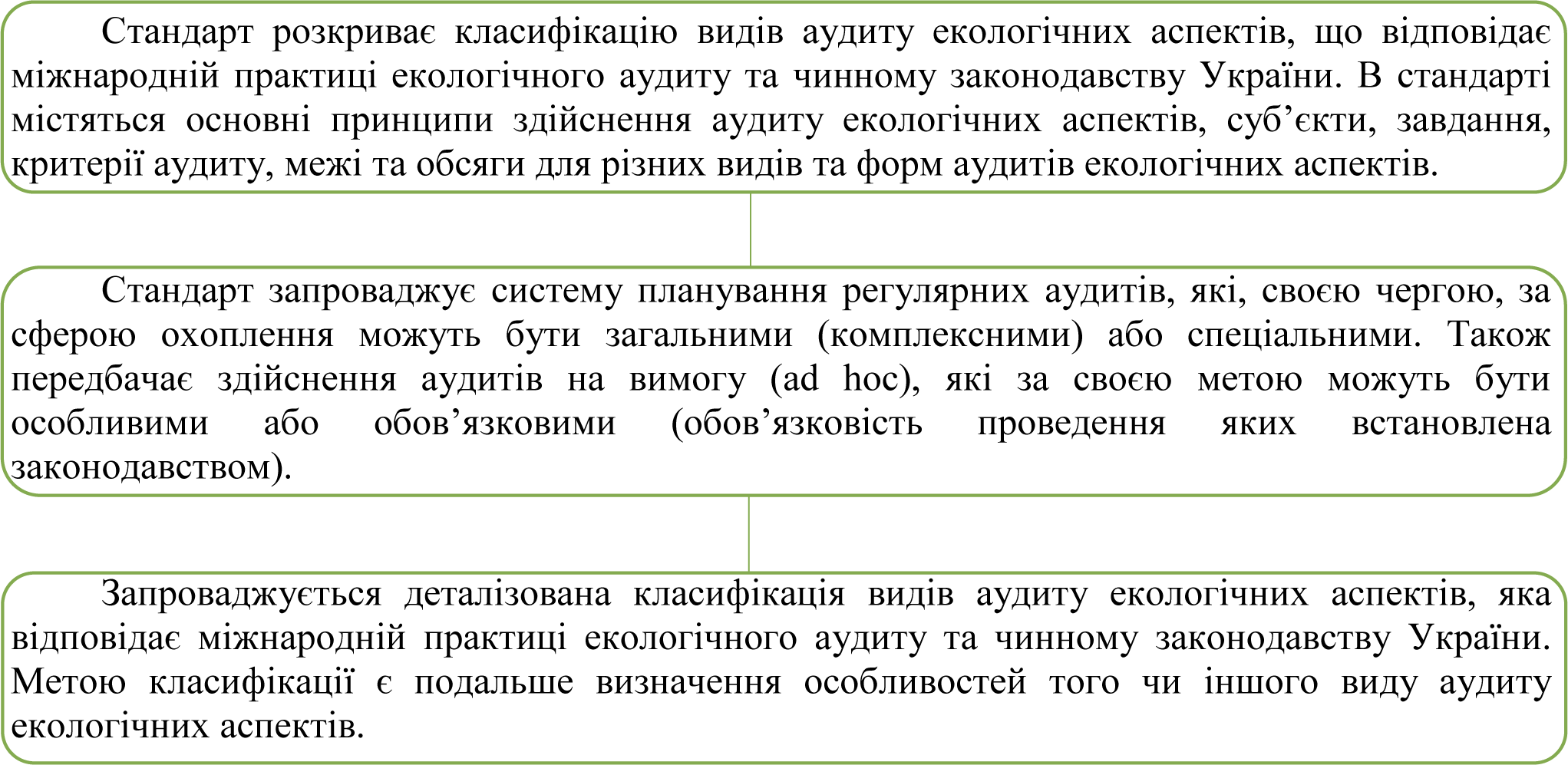 Метою цього стандарту також було завдання розширити поняття екологічного аудиту, який визначений Законом України «Про екологічний аудит» та розширити коло осіб, які можуть проводити екологічні аудити на корпоративному рівні, фахівцями-екологами, які сертифіковані як аудитори системи екологічного менеджменту відповідно до вимог і положень міжнародних стандартів ISO 14001:2015 та ISO 19011:2018.